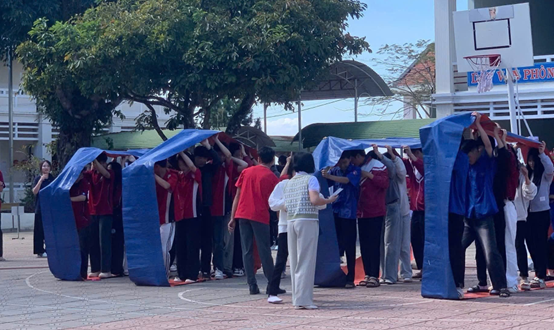 Tiếp nối chương trình, phần hội diễn ra sôi nổi với các trò chơi vận động mang tính tập thể cao, thu hút sự tham gia của học sinh toàn trường. Mỗi khối lớp đảm nhận một trò chơi riêng, phù hợp với đặc điểm lứa tuổi và yêu cầu vận động khác nhau. Khối 10 mang đến không khí kịch tính qua trò chơi “Sóng nước về đích”, đòi hỏi sự nhanh nhẹn và phối hợp linh hoạt. Khối 11 thể hiện sự khéo léo và nhịp nhàng trong trò chơi “Nhịp điệu đồng tâm”, nhấn mạnh tinh thần phối hợp tập thể. Trong khi đó, khối 12 gây ấn tượng với trò chơi “Bánh xe khổng lồ”, qua đó thể hiện sức mạnh, bản lĩnh và tinh thần đoàn kết của học sinh cuối cấp.